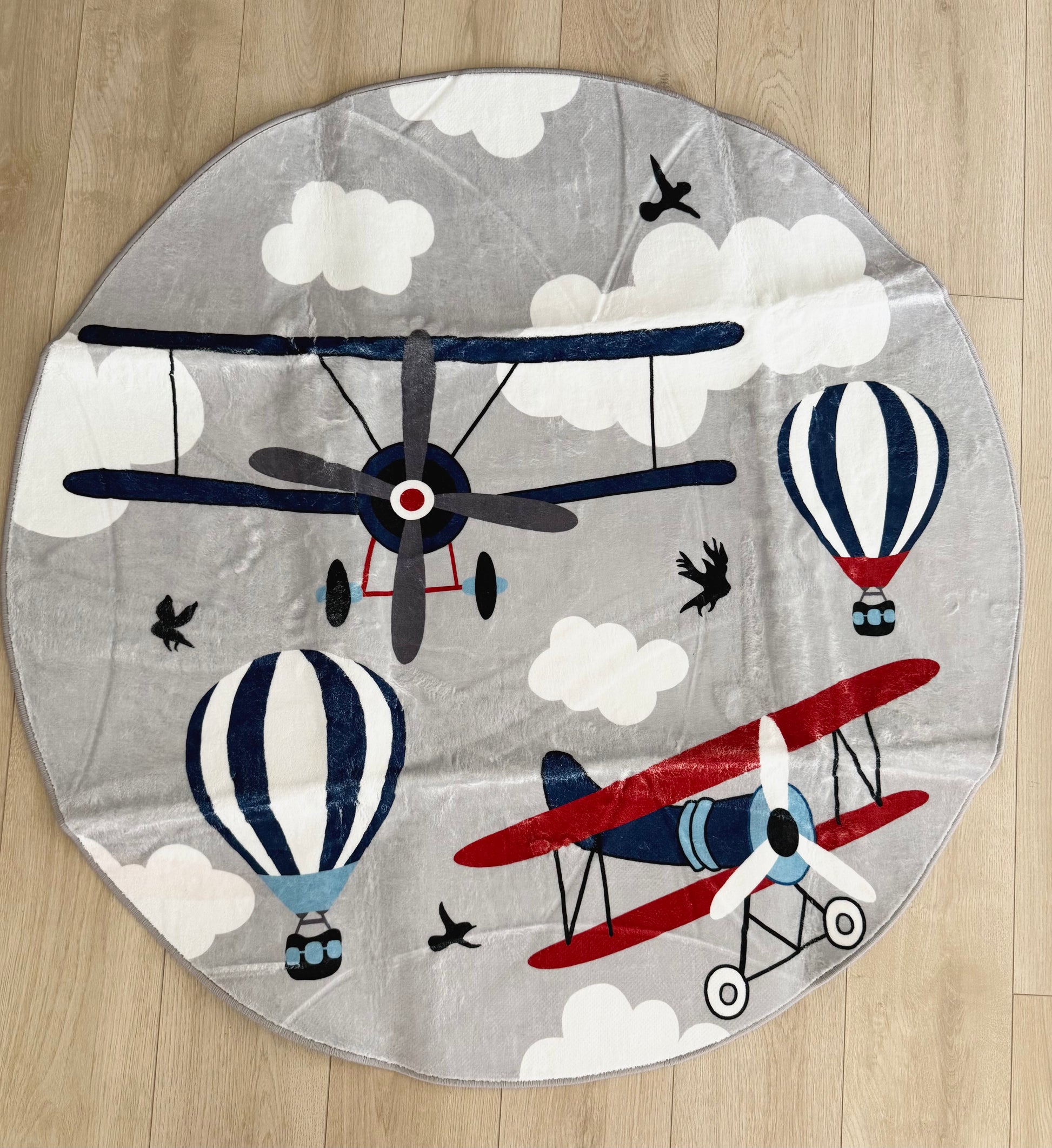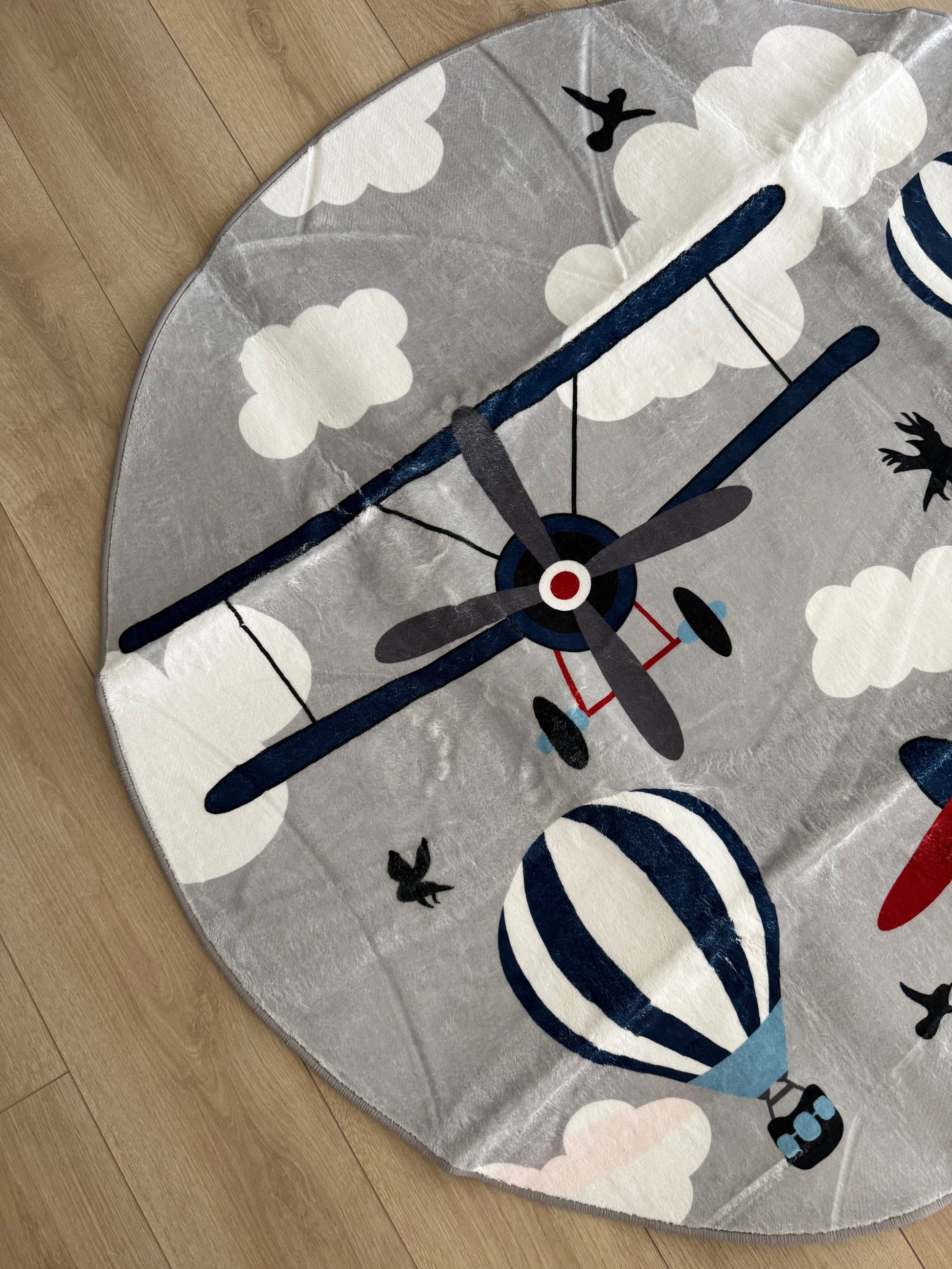 This rug adds a touch of artisanal charm to your little one's space, grey colored children's rug is the perfect accessory to make the nursery or toddler room cozier. The children's rug has diameter 120 cm and not strait round shape ! The rug is super soft, making it the perfect addition to the play, reading or cuddle corner. More over, children's rug is also super practical and easy to maintain. Add warmth and fun to your child's room with Helicopter round rug !