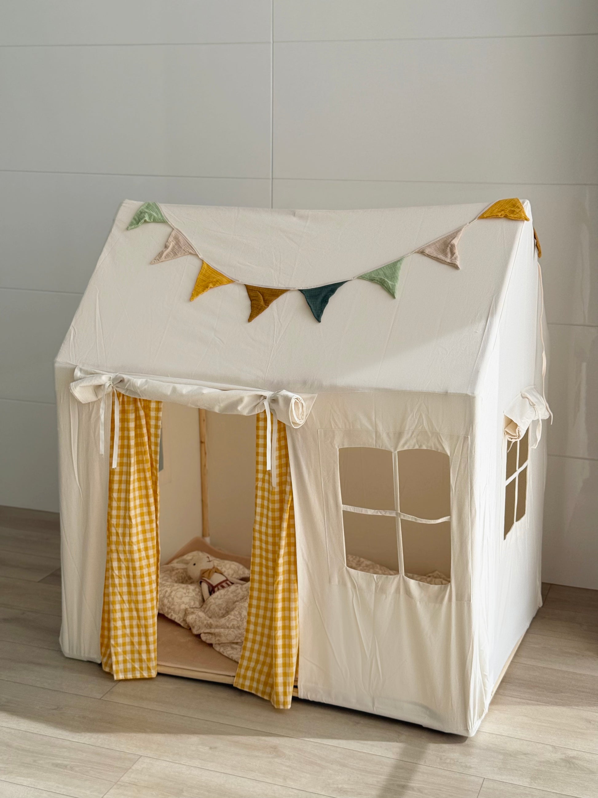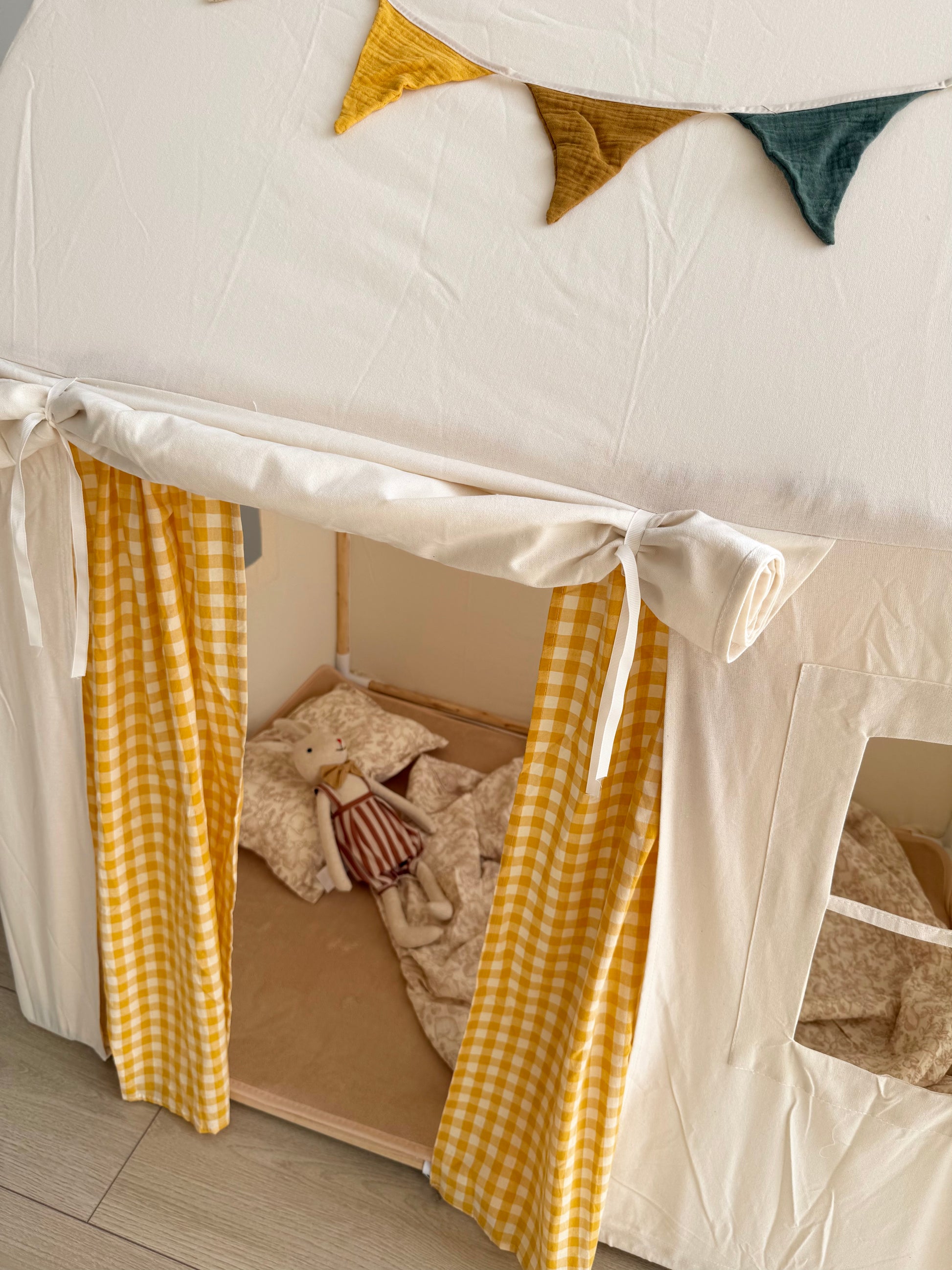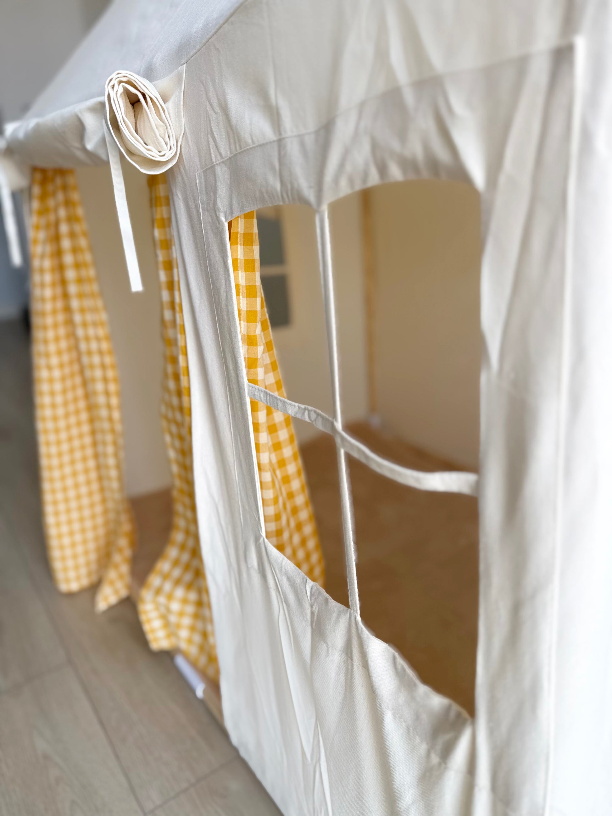 Our House Tent in Ivory color with yellow curtains letting kids to take a nap inside, encourage themselves sleeping! You can decorate it with flag garland or cotton lights! Add some cushions and cover for your little one to feel like in real small cozy house !