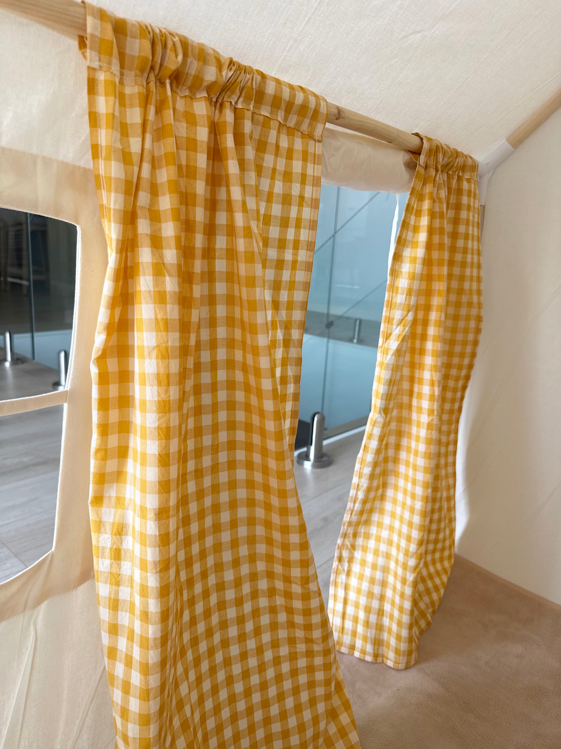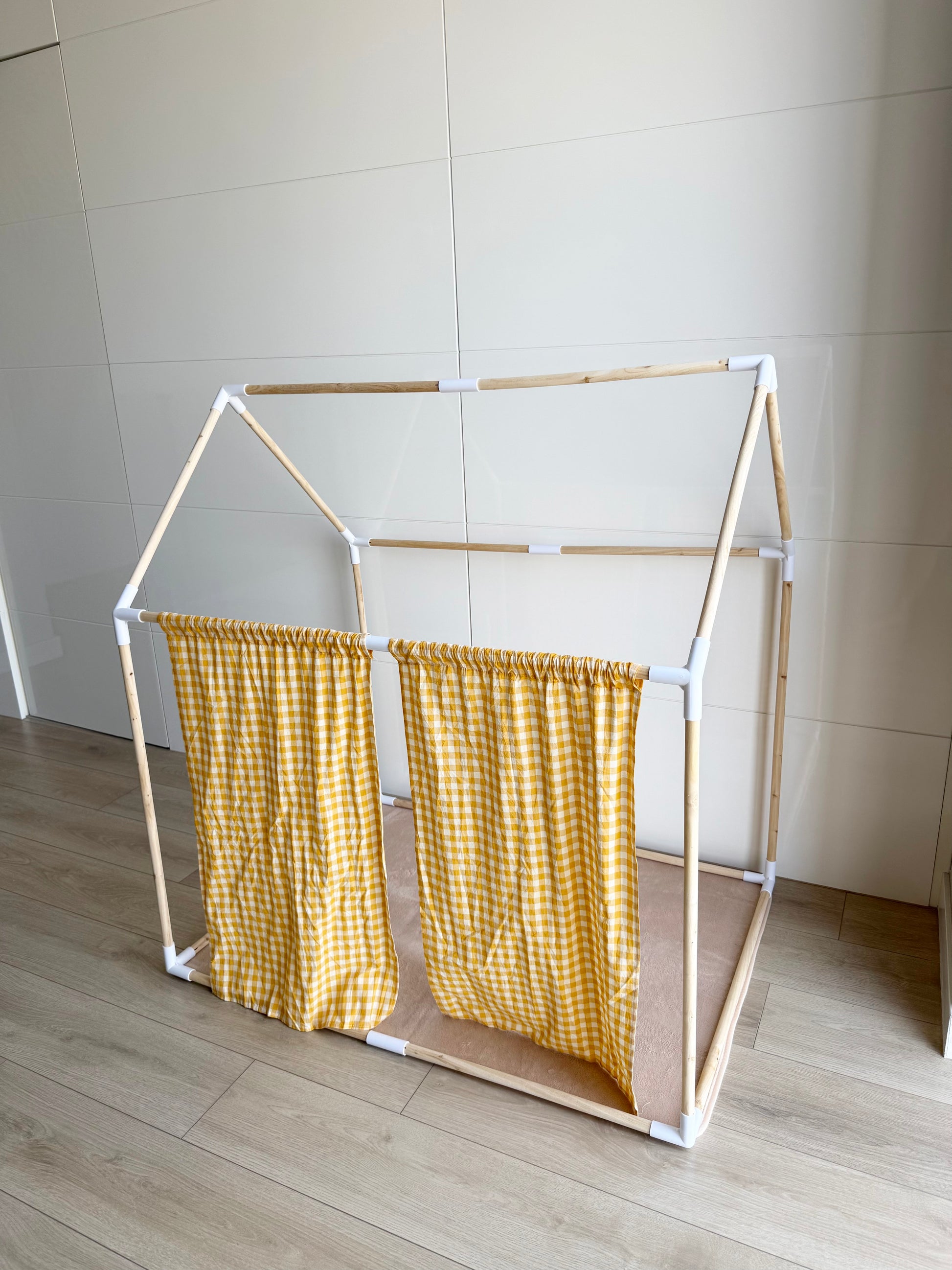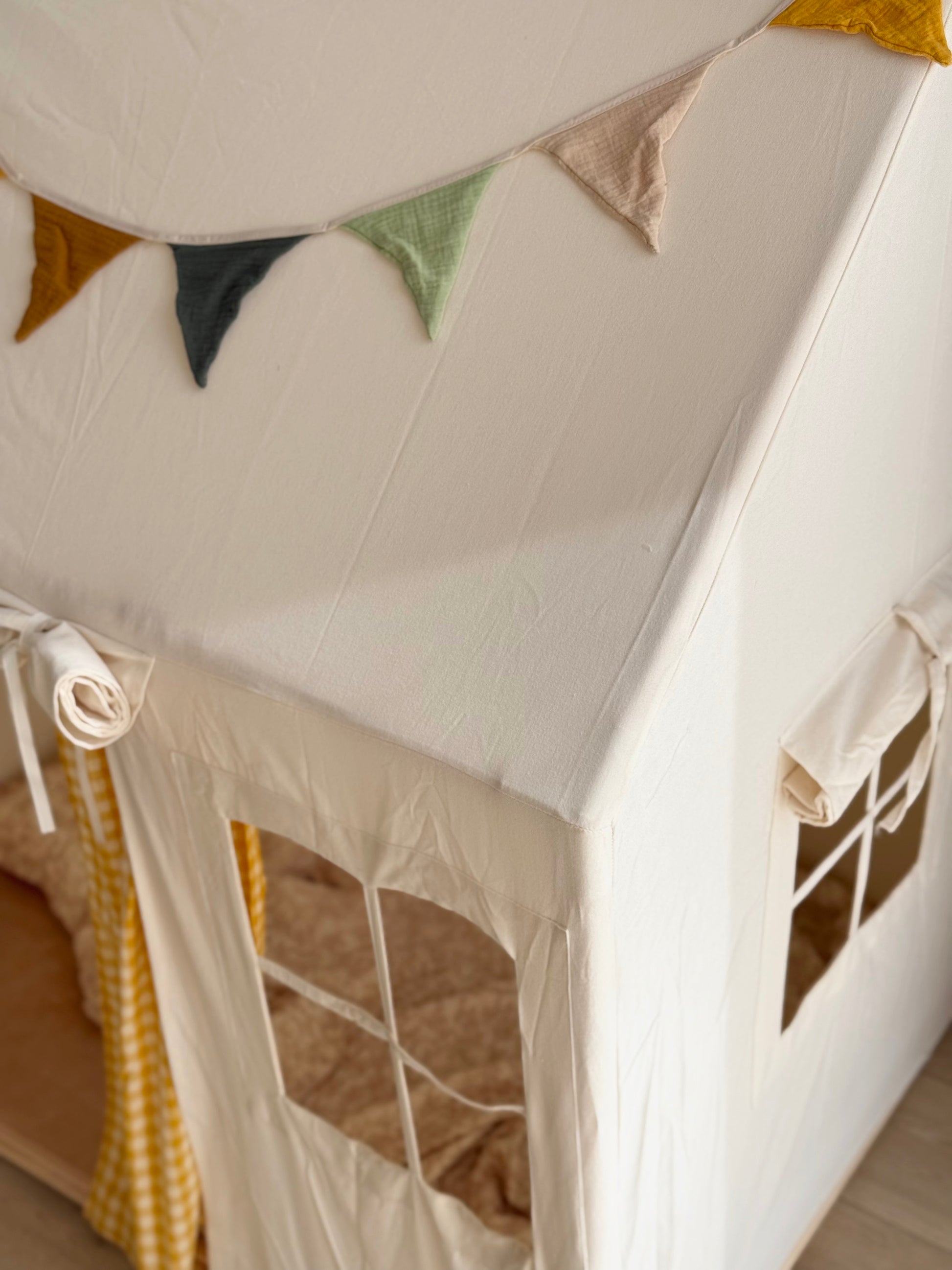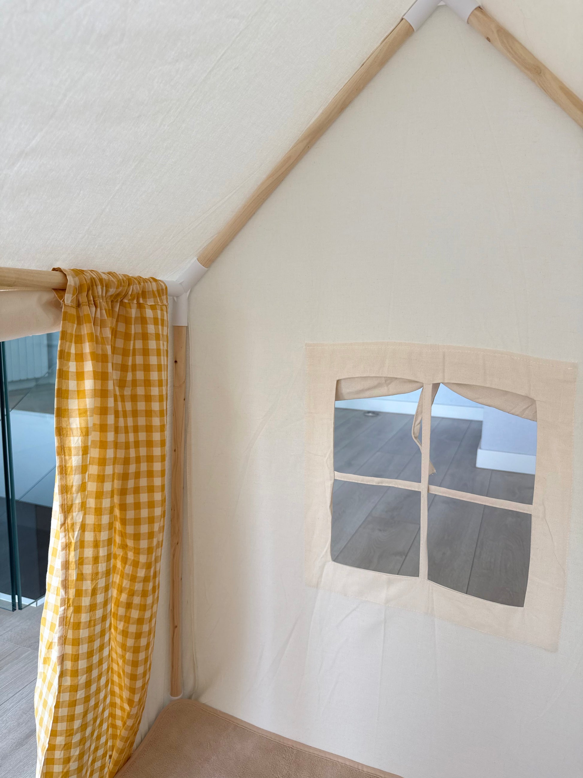 Our House Tent in Ivory color with yellow curtains letting kids to take a nap inside, encourage themselves sleeping! You can decorate it with flag garland or cotton lights! Add some cushions and cover for your little one to feel like in real small cozy house !