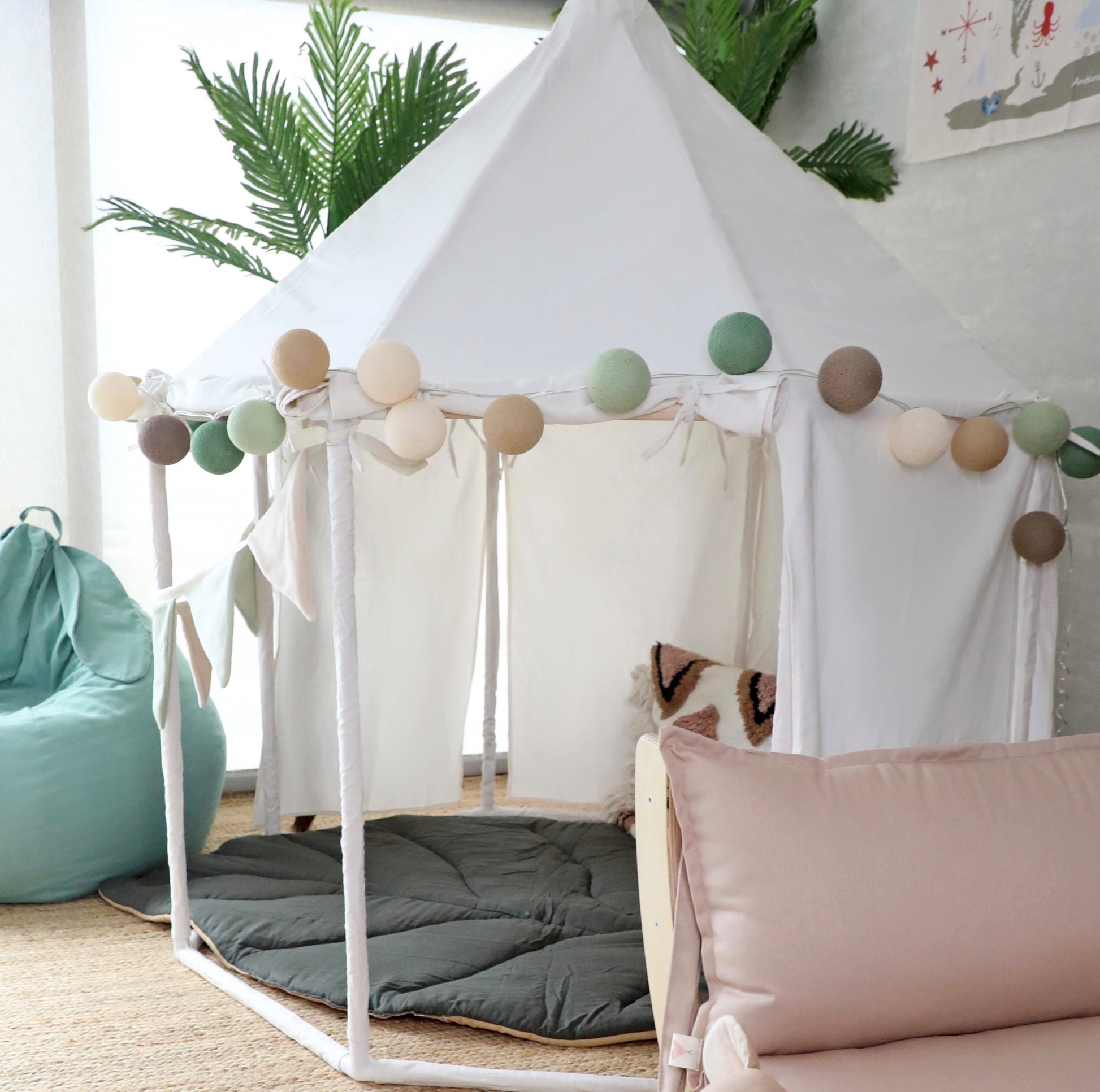 Fabulous, roomy and versatile Pavilion Play tent is a lovely addition to any playroom and guaranteed to provide hours of fun. Each of the side panels can be rolled up or down so you can choose to create an open play space or a cozy den, with plenty of room to invite friends! Use as a play house, shop or cozy hide out...the possibilities are endless! The soft neutral tone is a big hit with parents too.