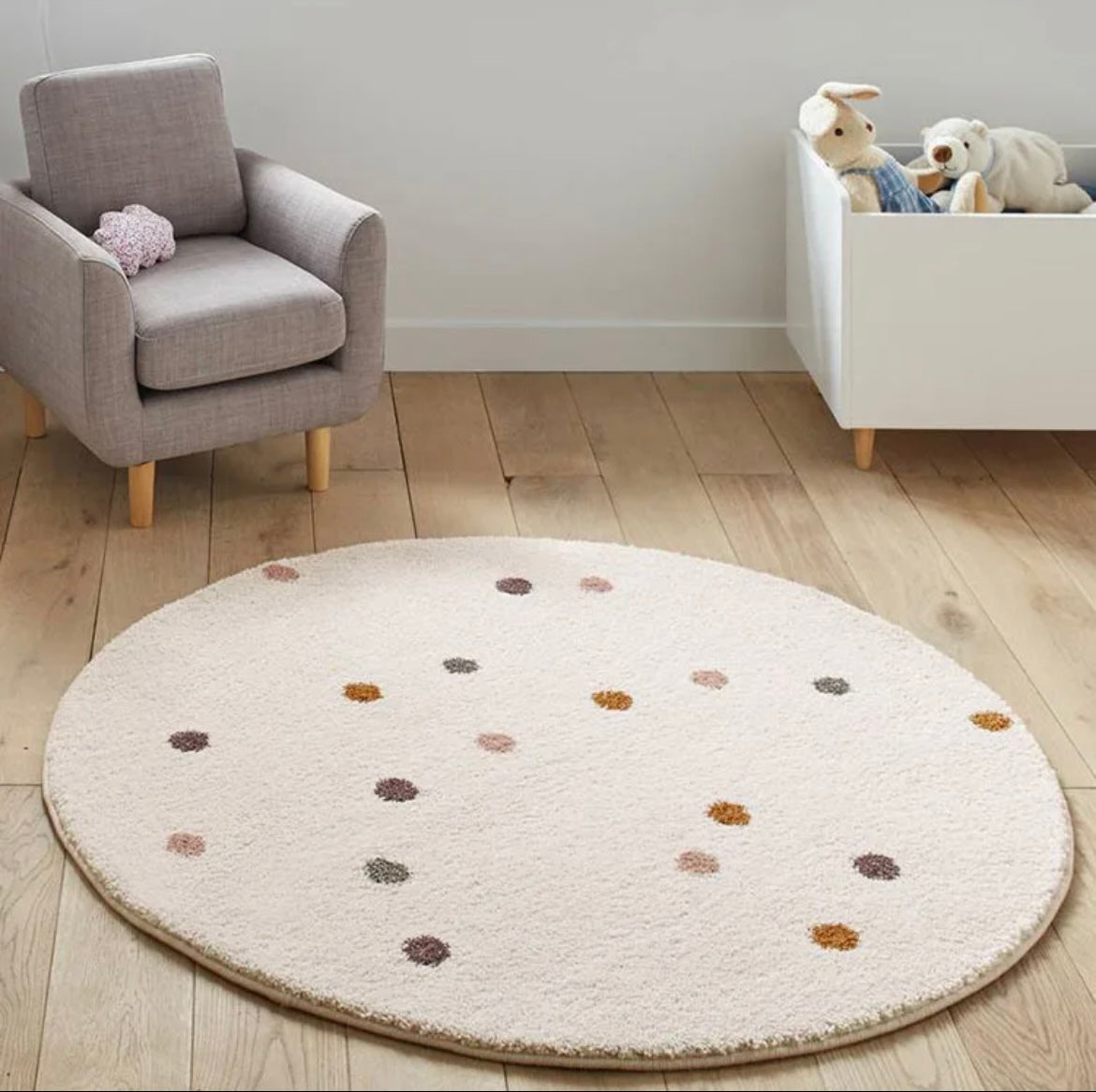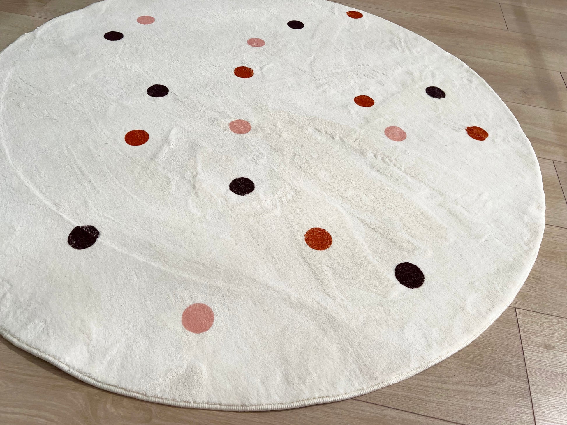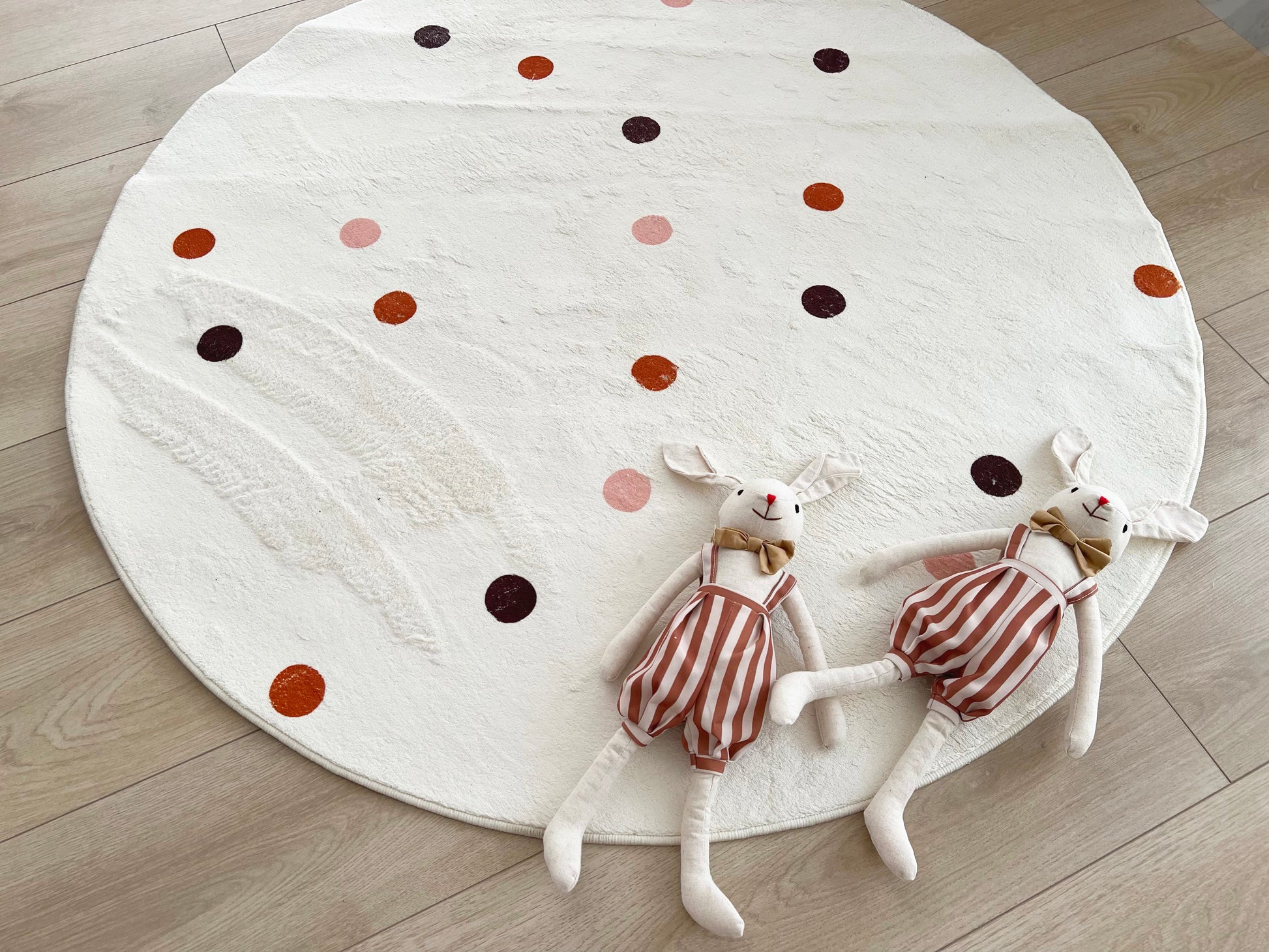 This cute, colorful children's rug is the perfect accessory to make the nursery or toddler room cozier. The round, polka-dotted children's rug diameter is 120 cm, a white base and dots in pink, brown and orange. The rug is super soft, making it the perfect addition to the play, reading or cuddle corner. More over, children's rug is also super practical and easy to maintain.