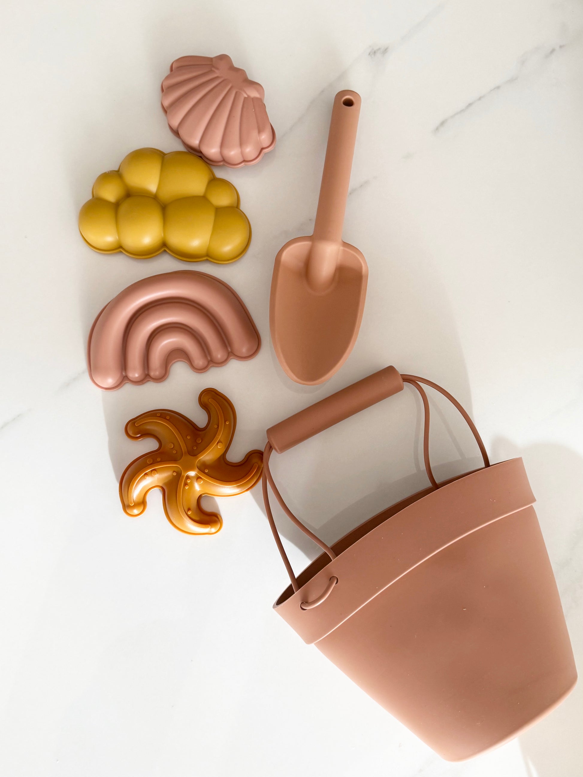 Our Sand Toy Sets can do it all! Whether it's the beach, sand box, a sensory bin, bath time, and even the snow - your little one will get hours out entertainment out of these. They are also very travel friendly - the bucket will fit all 5 pieces and the soft, flexible silicone allows you to stuff it in a suitcase or throw them in the back of your car without having to worry about it cracking or taking up too much space.
