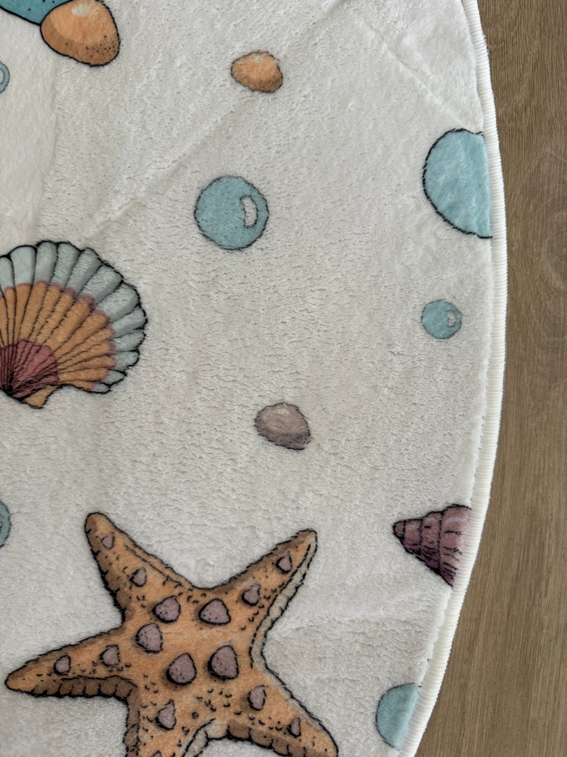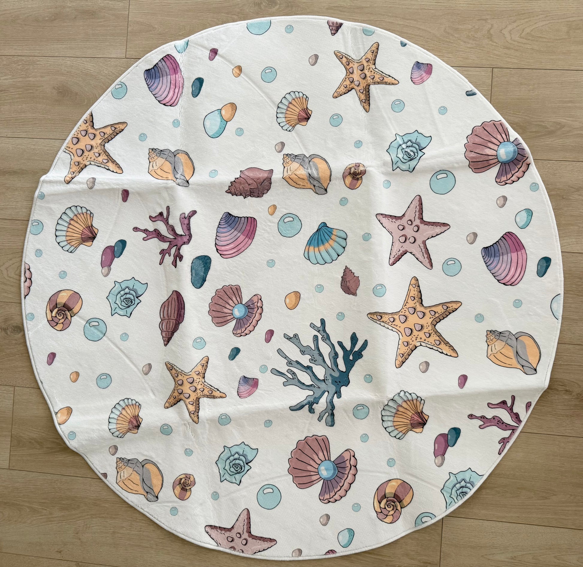 This rug adds a touch of artisanal charm to your little one's space, multicolored children's rug with pink shells is the perfect accessory to make the nursery or toddler room cozier. The Shell children's rug has diameter 120 cm and not strait round shape ! The rug is super soft, making it the perfect addition to the play, reading or cuddle corner. More over, children's rug is also super practical and easy to maintain. Add warmth and fun to your child's room with this rug !