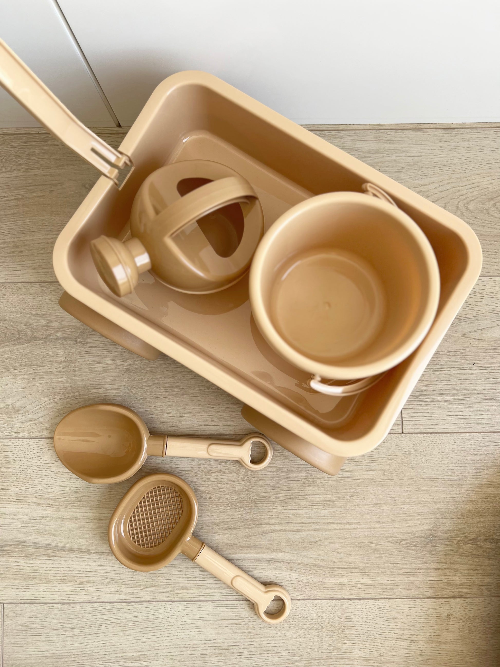 A wonderful summer set with a wheelbarrow, convenient for a baby and interesting games in the sand! Set of dark beige color, suitable for both a girl and a boy, made of durable, high-quality soft glue material! The set includes a wheelbarrow, calico, a shovel, a scoop, and a watering can !