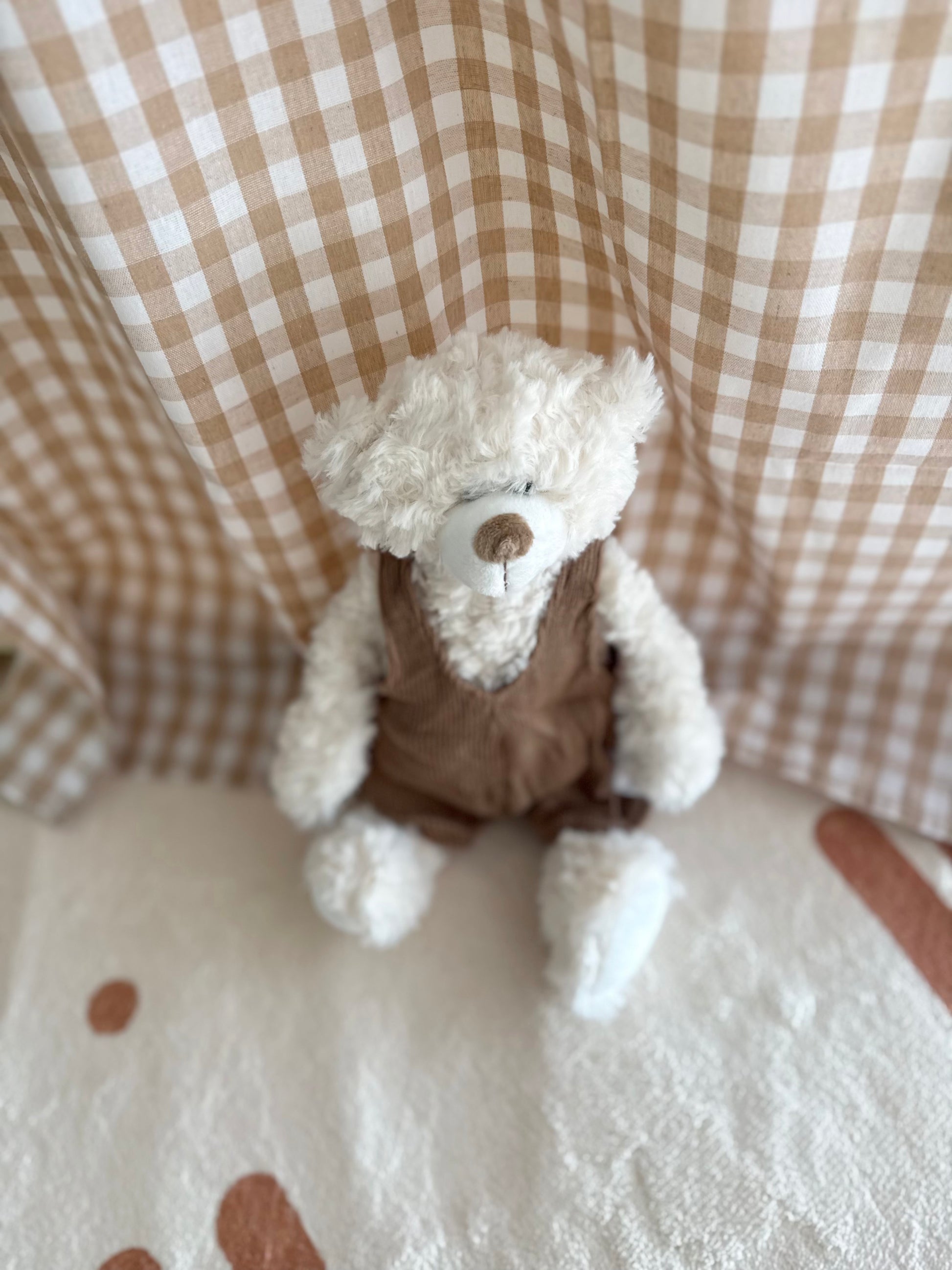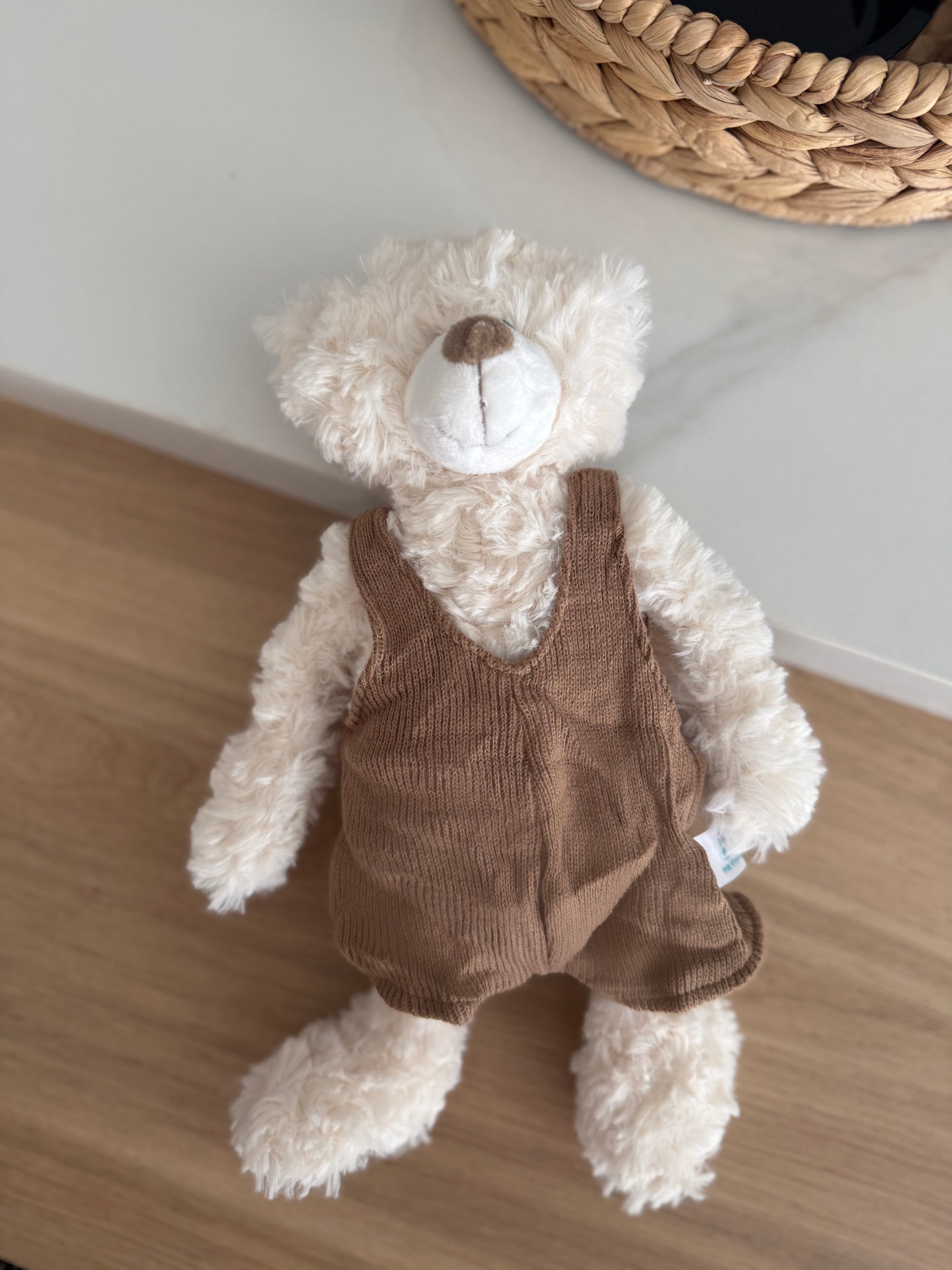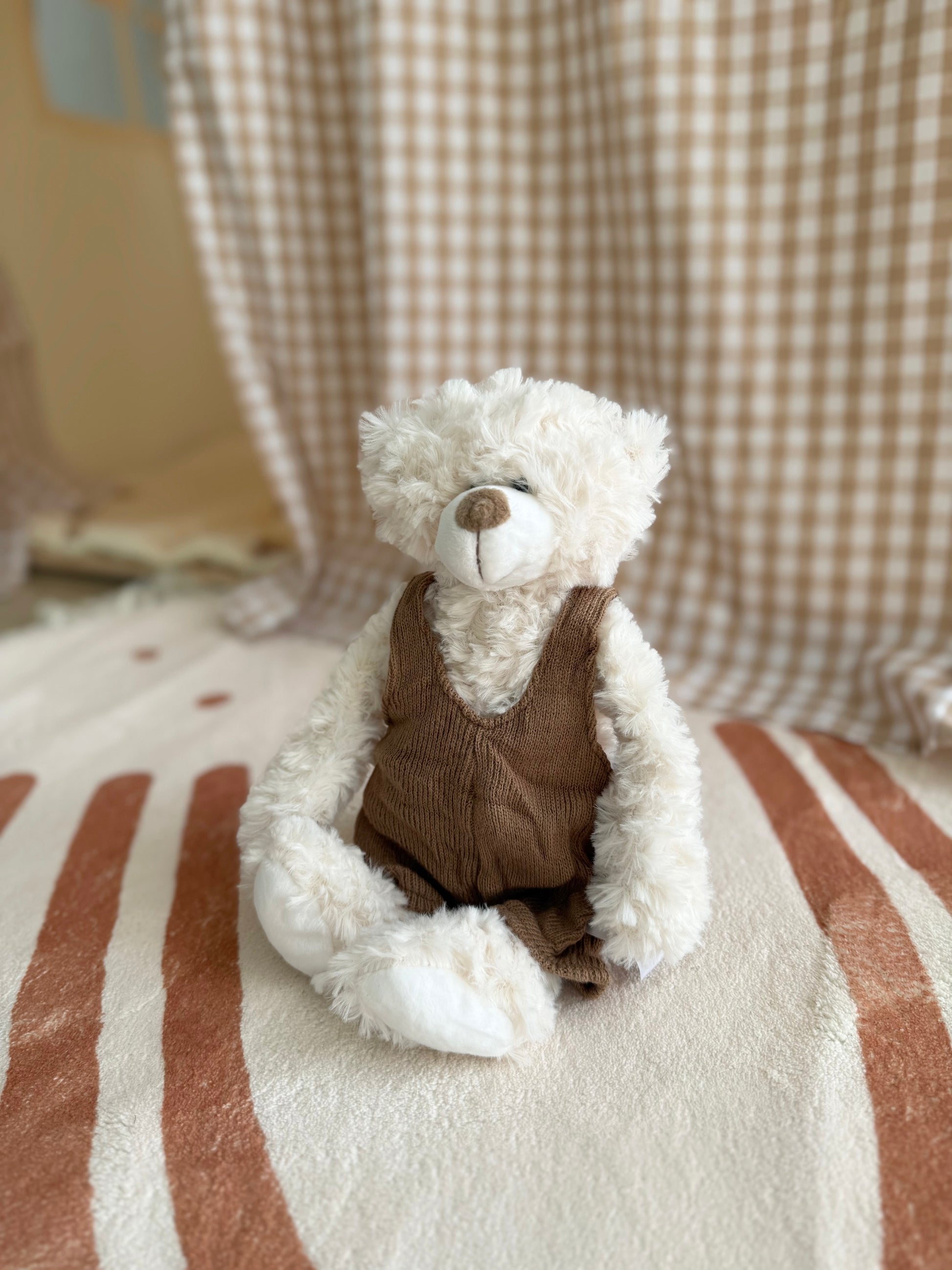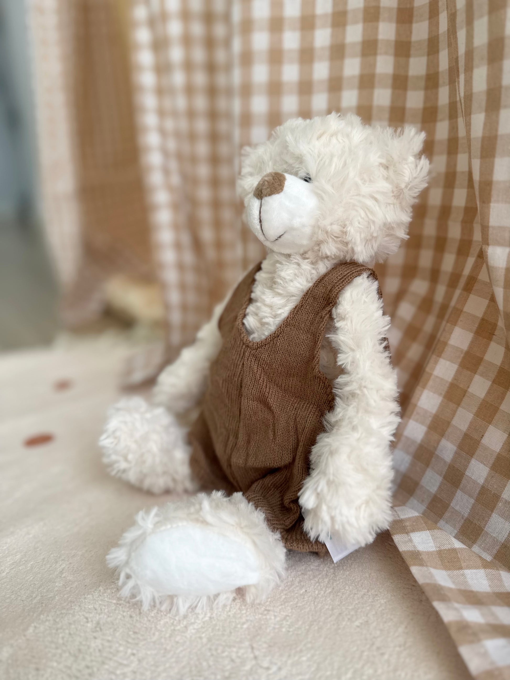 The White teddy bear in cute brown overalls will be baby's best companion for sweet naps or for the most exciting adventures!