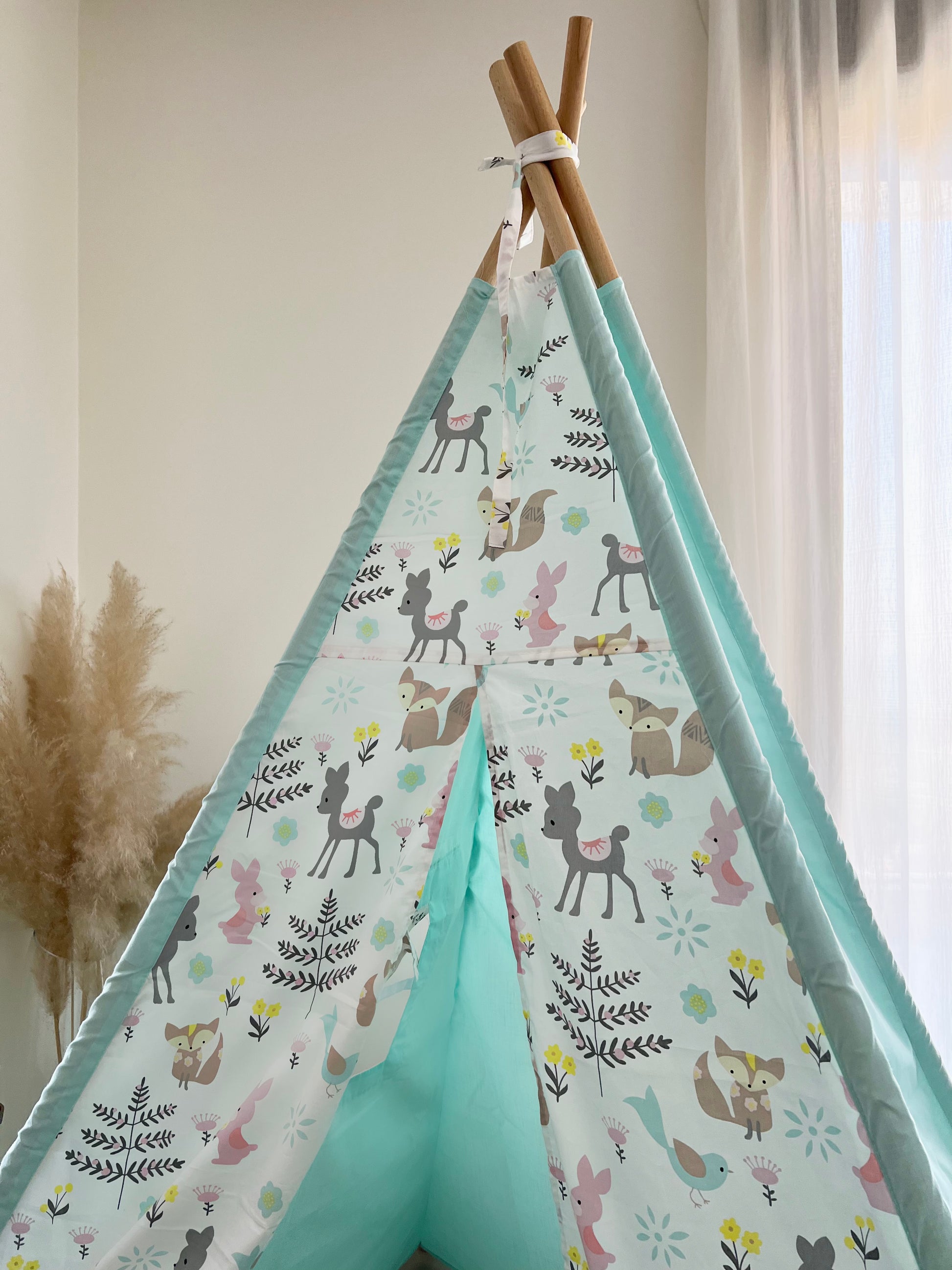 The baby Deer teepee features a unique print born out of love for hiking in the forest and sleeping in a tent in the wild. With beautiful lead motifs : baby cute deer, fox and birds .