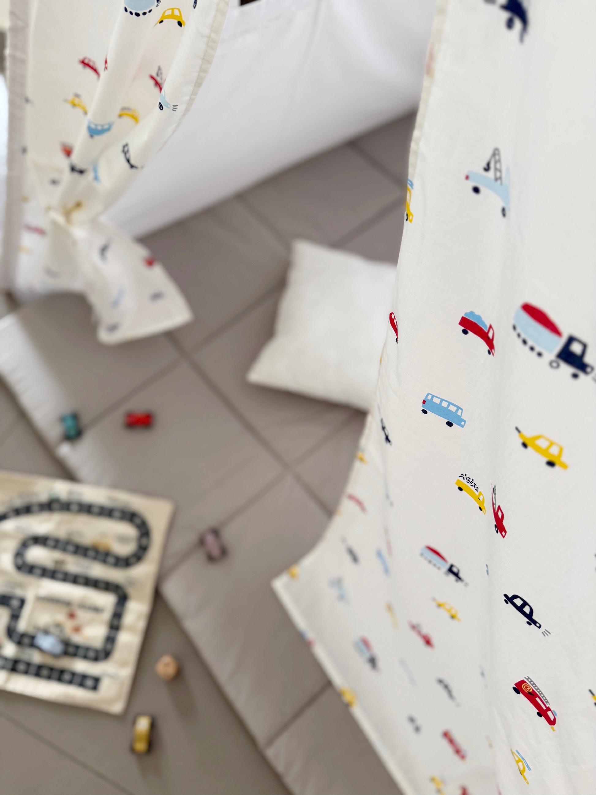 It is suitable for children from 3 years old and up. However, if there is an adult, it can also be used by children under 3 years old because the padded mattress protects the time of the game. Also the mattress at the bottom can be used individually as a playmat. The children's tent is 100% handmade and consists of cotton fabric !