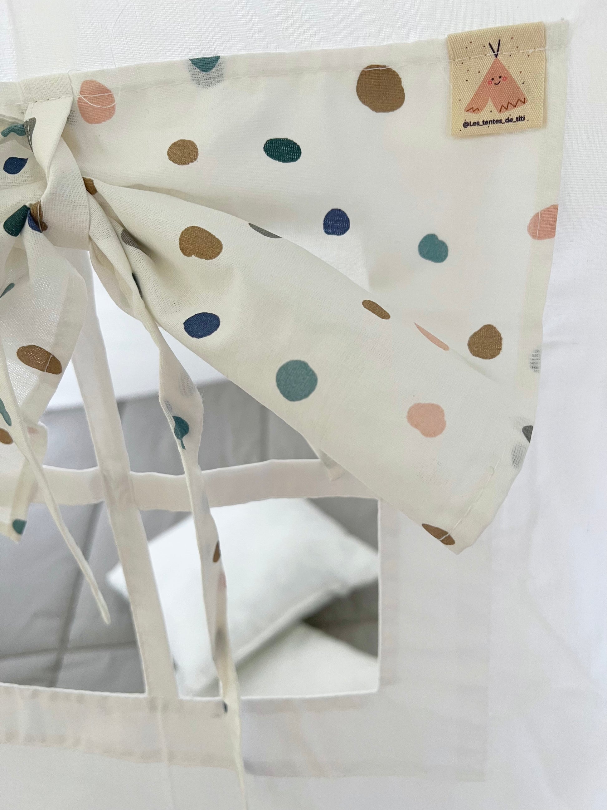 Sides of the tent in white color, curtains with polka dots and padded mat with plain light grey color !