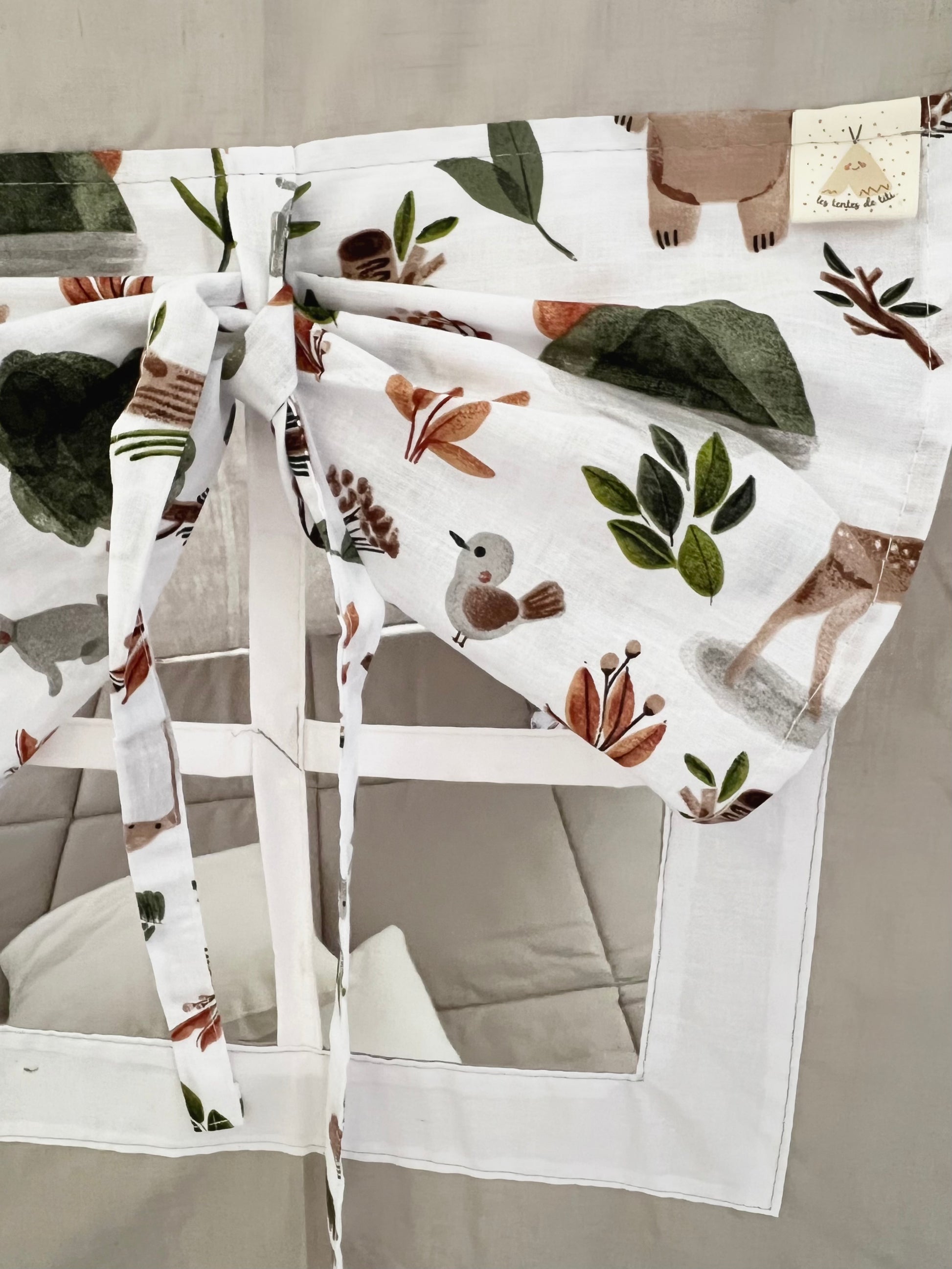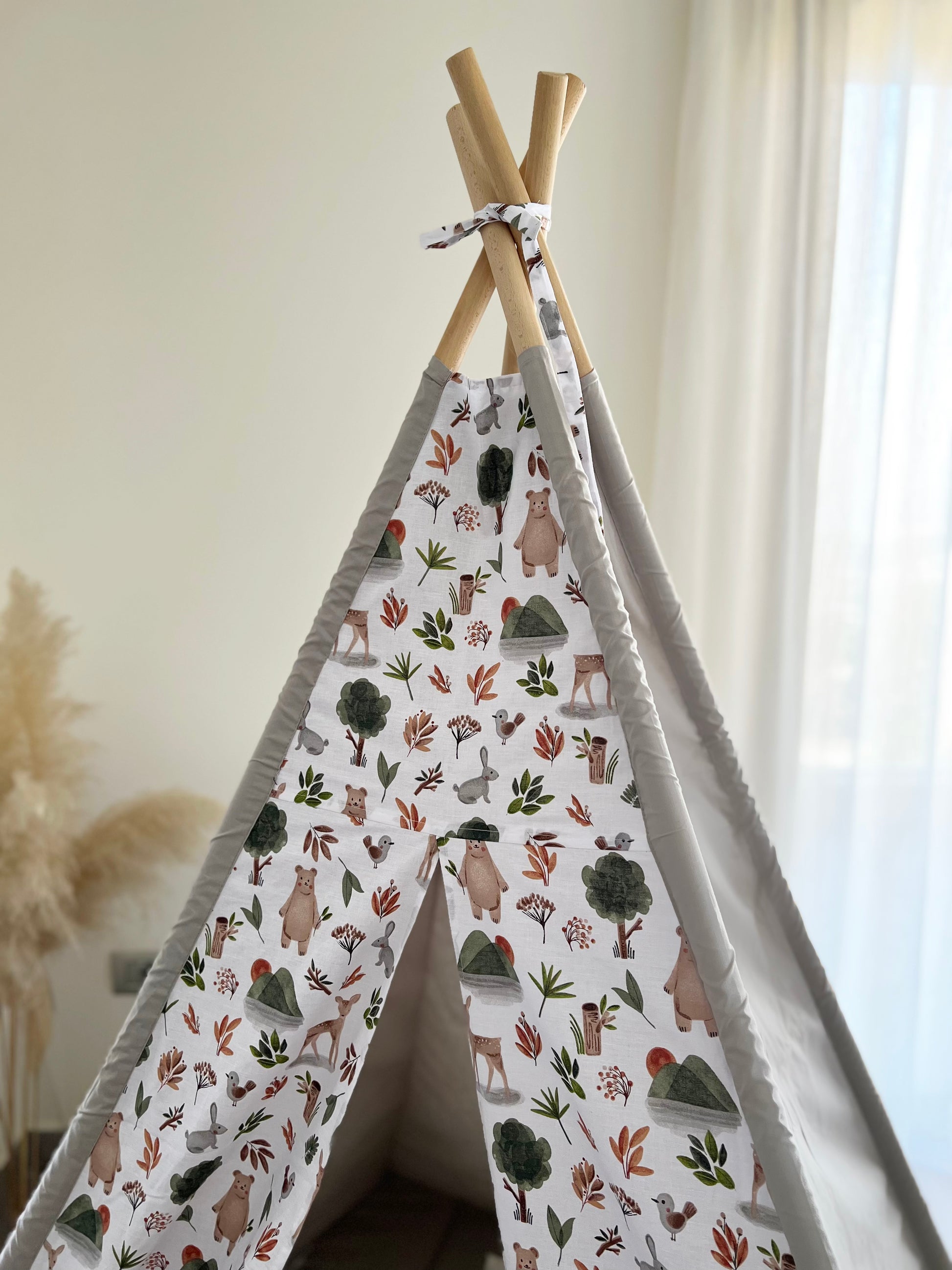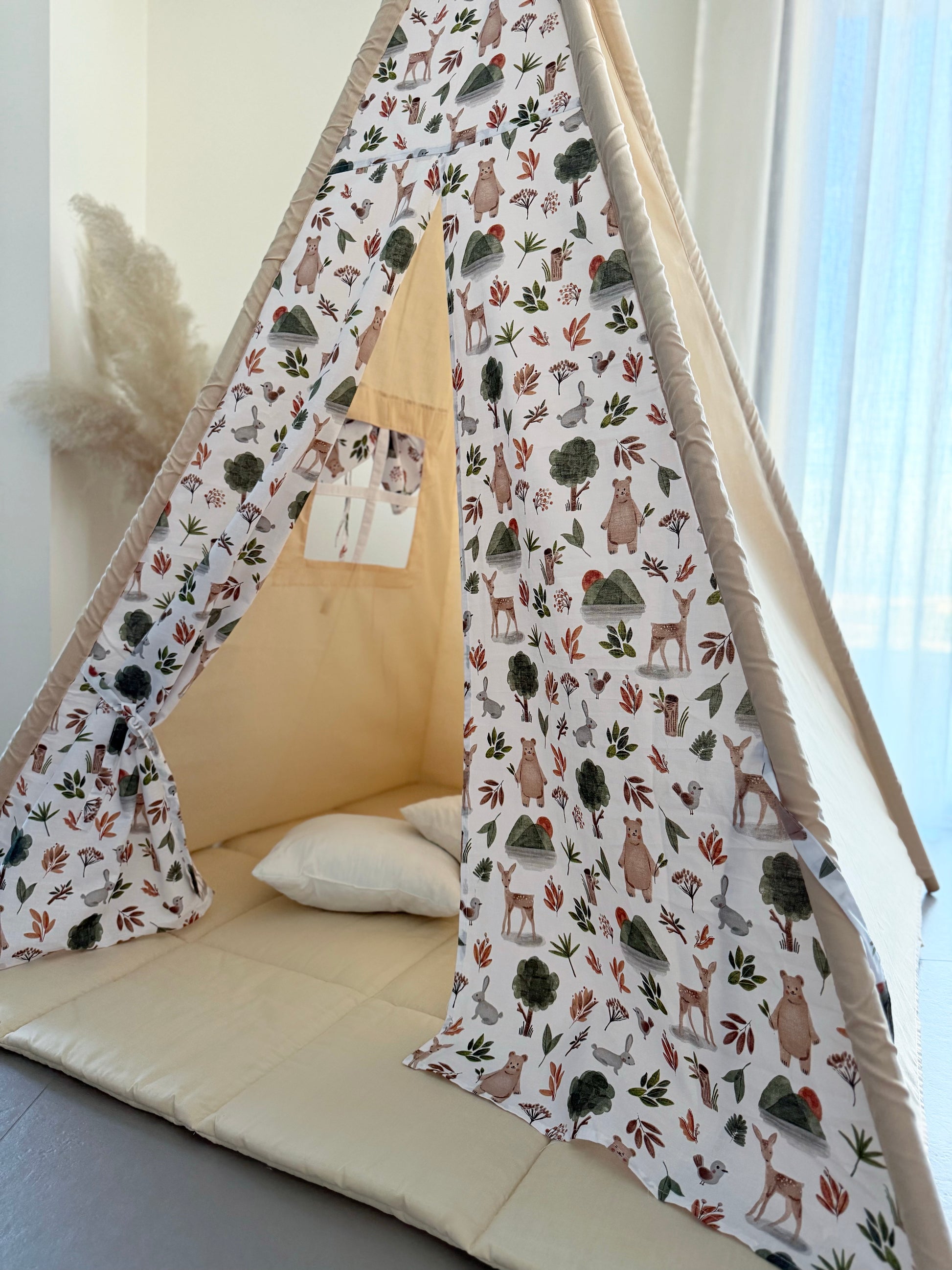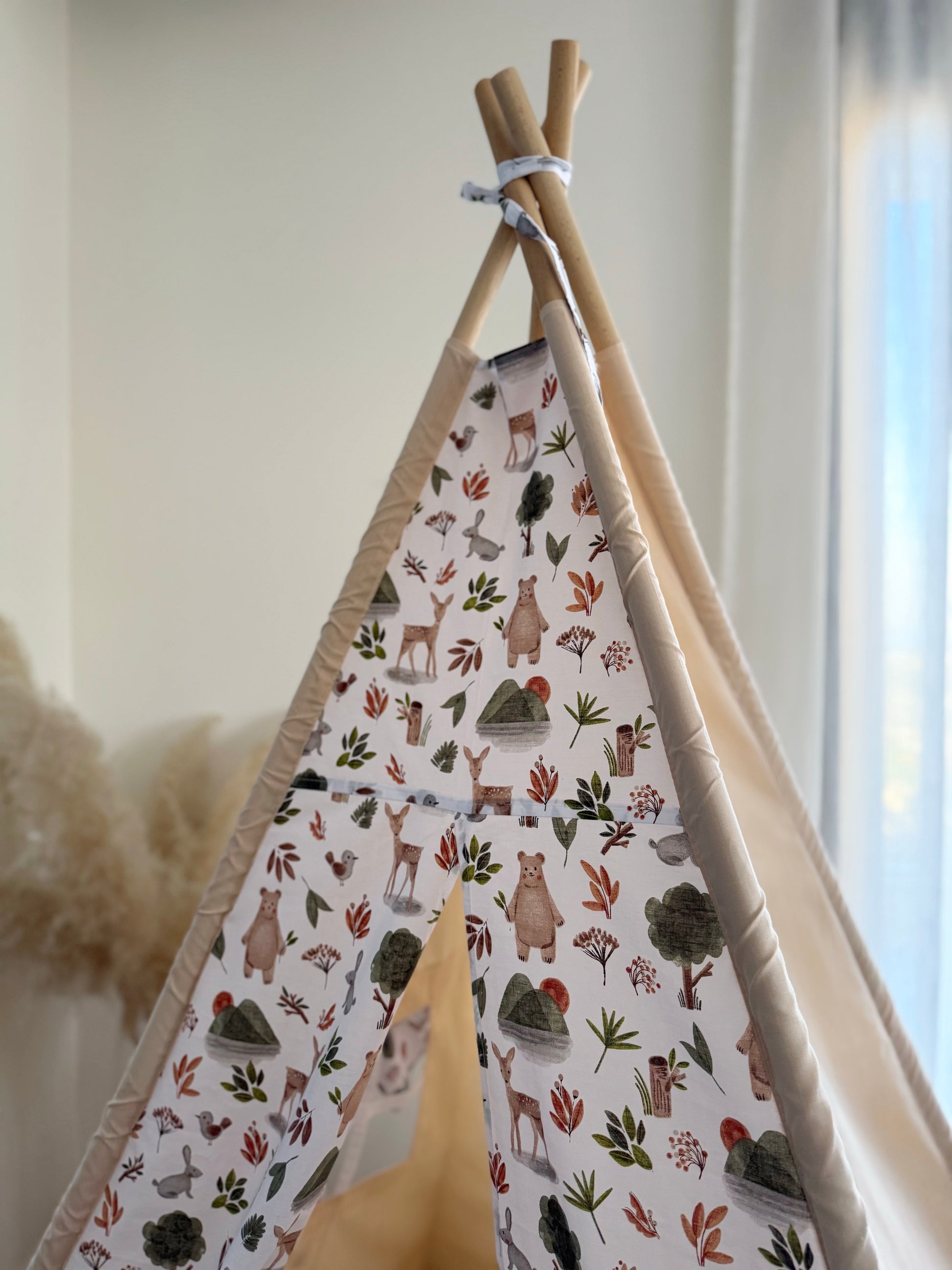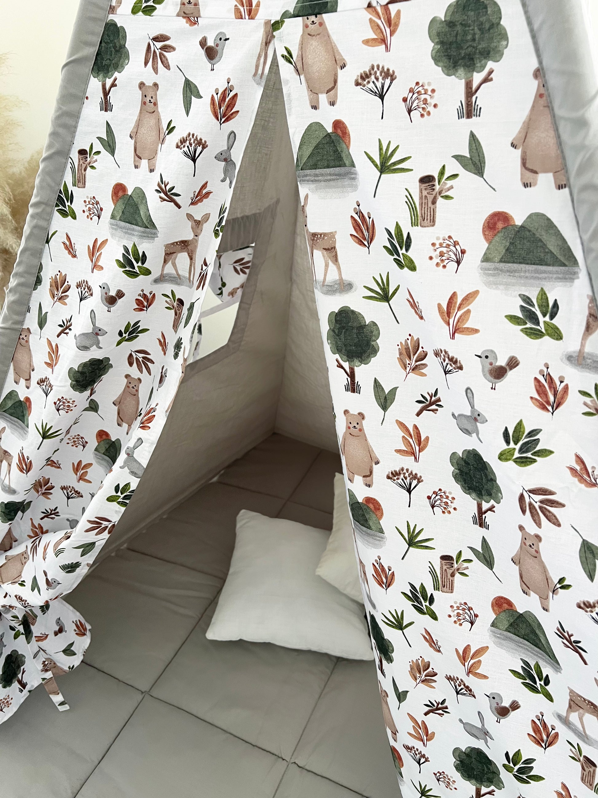 The forest teepee features a unique print born out of love for hiking in the forest and sleeping in a tent in the wild. With beautiful lead motifs , bear, fox and tents .