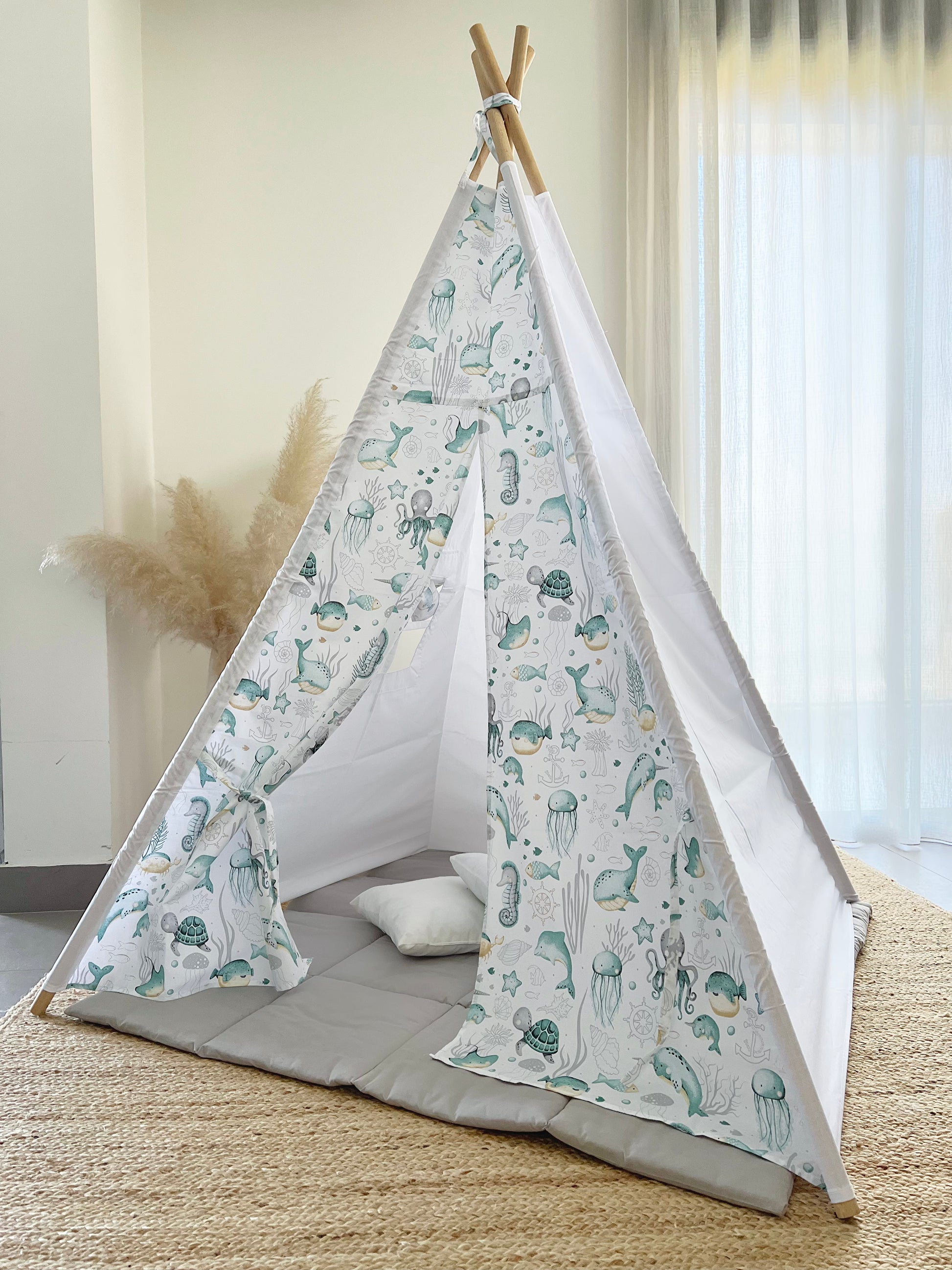 Featuring an amazing print of ocean life, kids will love to explore in this fun teepee!